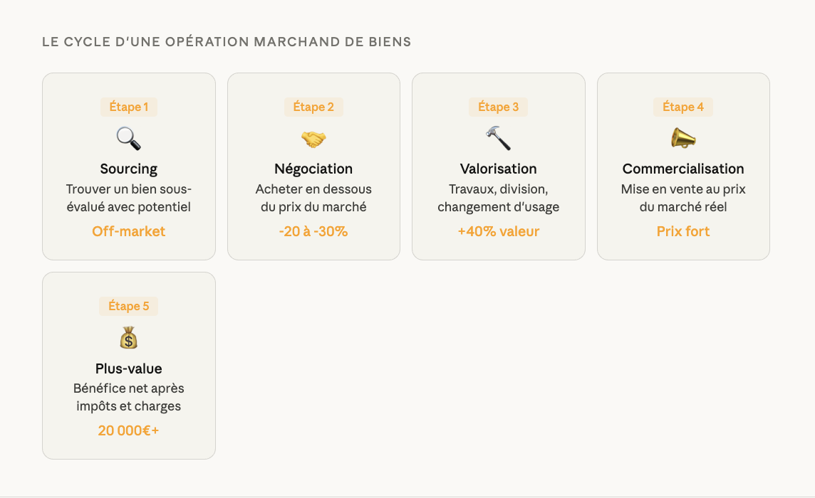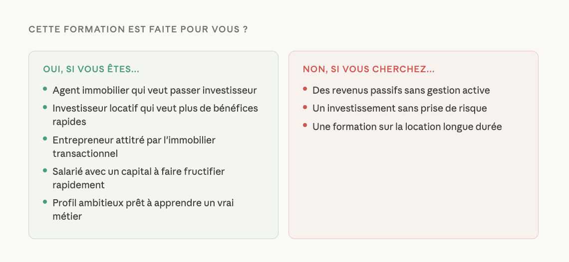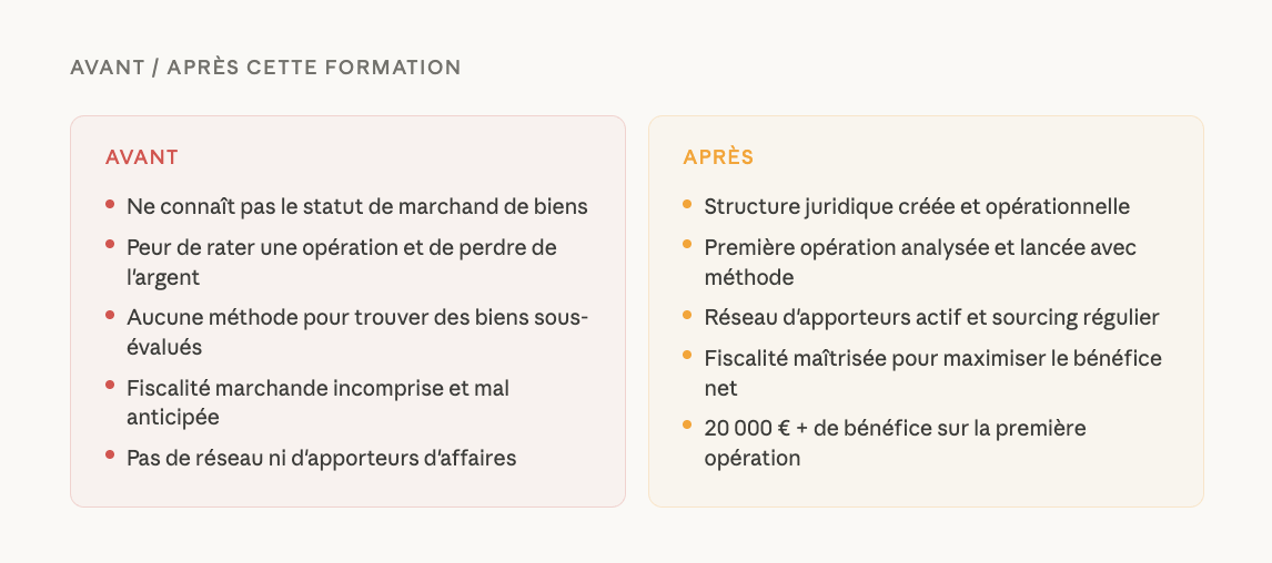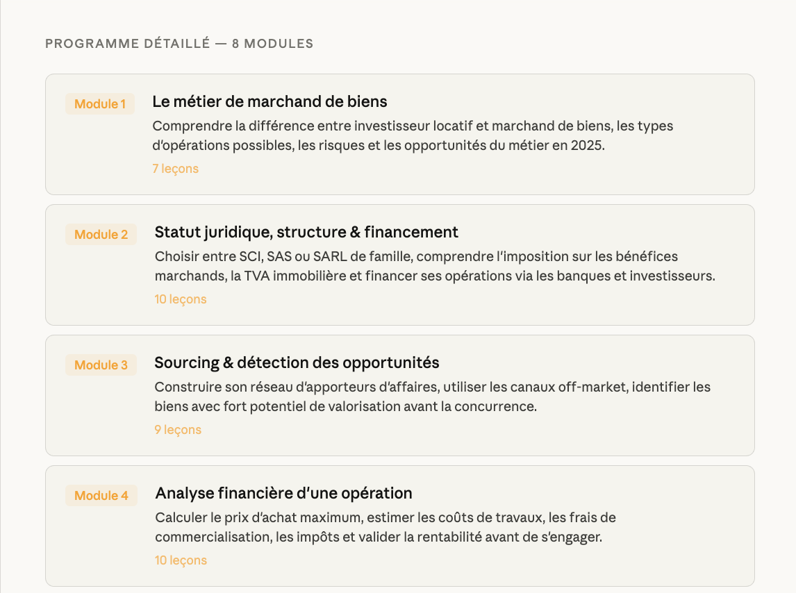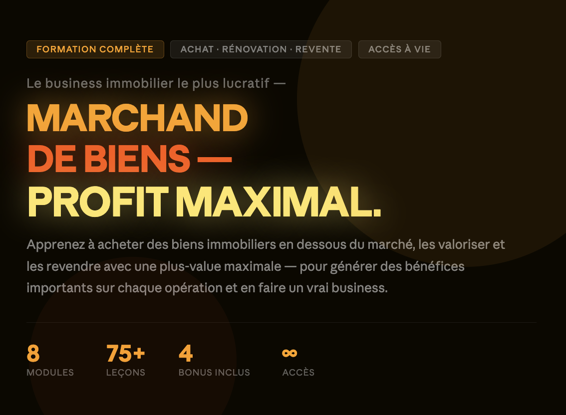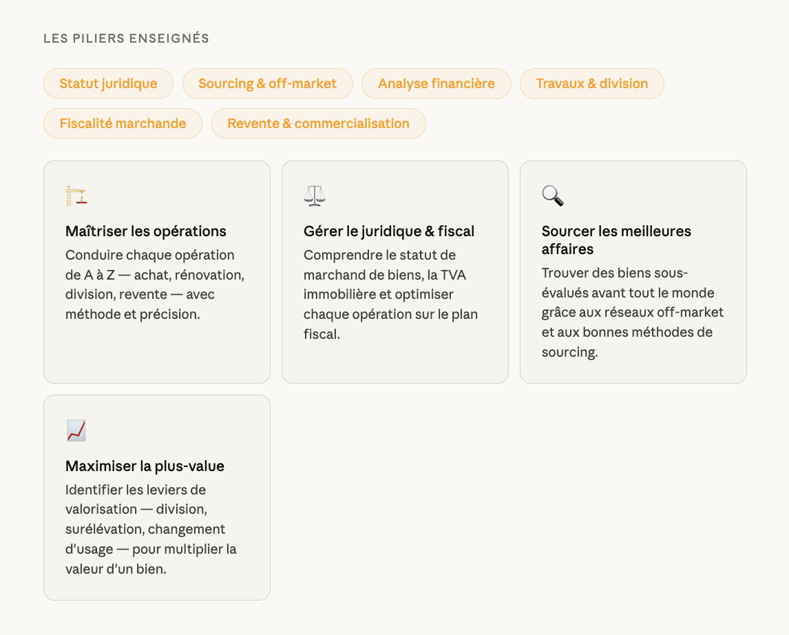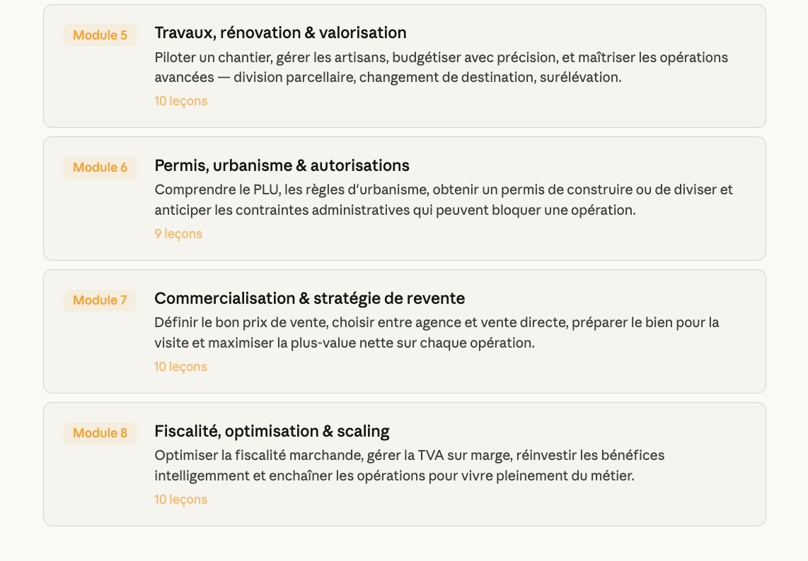 Toutes les formations indispensables pour réussir son activité de marchand de biens en tant que professionnel. Disponible pour un niveau amateur ou confirmé.